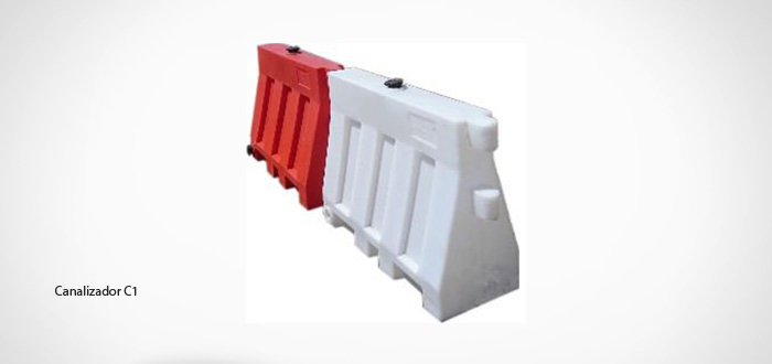 Canalizador vial fabricado por un sistema de inyección en PVC con el agregado de filtros UV para evitar que las inclemencias del tiempo puedan afectar el color del producto a lo largo del tiempo. Estan preparados para la incorporación principalmente de agua para garantizar su fijación al piso. Vienen presentados en color blanco y rojo y sus medidas son de 110 cm de largo, 80 cm de alto y 50 cm de ancho.