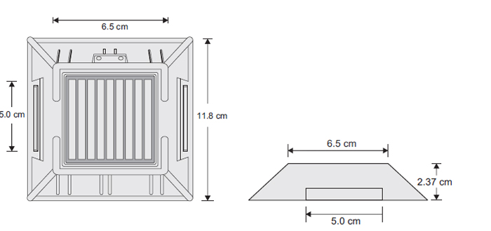 Material: Policarbonato br> Peso total aprox: 290.5 gr. br> Peso especifico (densidad) (ASTM D 792): 1.2 g/cm . br> Absorción de agua (24 H-23ºC) (ASTM D 570): 0.15. br> Temperatura de ablandamiento. (VICAT-5 KG.) (ASTM D 1525): 145-150 ºC %. br> Esfuerzo a la tensión ( ASTM D 638): 60-65 n/mm. br> Resistencia dieléctrica (ASTM D 149): 20 kv/mm. br> Fortaleza a la compresión carga máxima: 23,500 kg/cm. br> Mini panel solar de: Silicio. br> Medidas: L: 55 mm, A: 55 mm, E: 0.2 mm. br> Led color: Rojo de alta intensidad. br> Cantidad: 2. br> Tiempo de vida aprox de los leds: 100,000 hrs. br> Intensidad luminosa led: + de 6500 milicandelas. br> Baterías de larga duración recargables de: NK-MTH. br> Capacidad baterías sin sufrir efecto de memoria: 650 ma. br> Secuencia intermitente de luz: 80 parpadeos X minuto. br> Color: Ámbar. br> Medidas generales: Largo: 11.8 cm, Ancho: 11.8 cm, Altura: 2.37 cm. br> Distancia aprox. de visibilidad del led: 300 metros. br> Eficiencia del circuito: 36 hrs funcionando con 7 hrs de carga expuesta al sol directo. br>